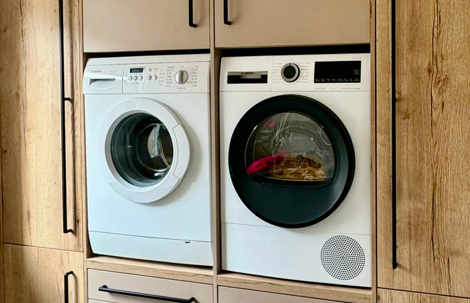 Les clients souhaitaient un aménagement de buanderie entièrement sur mesure afin d’optimiser un mur complet du sol au plafond. L’objectif était de créer un espace fonctionnel capable d’intégrer les équipements tout en dissimulant les éléments techniques.