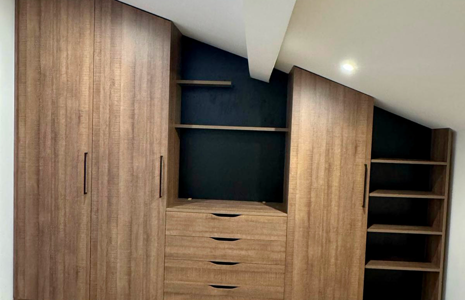 Ce projet avait pour objectif d’aménager un espace double fonction, moderne et sur mesure, au sein d'une chambre. Le choix d'un décor en chêne authentique brun apporte une esthétique chaleureuse et intemporelle, parfaitement adaptée à l'atmosphère apaisante d'une pièce de nuit.