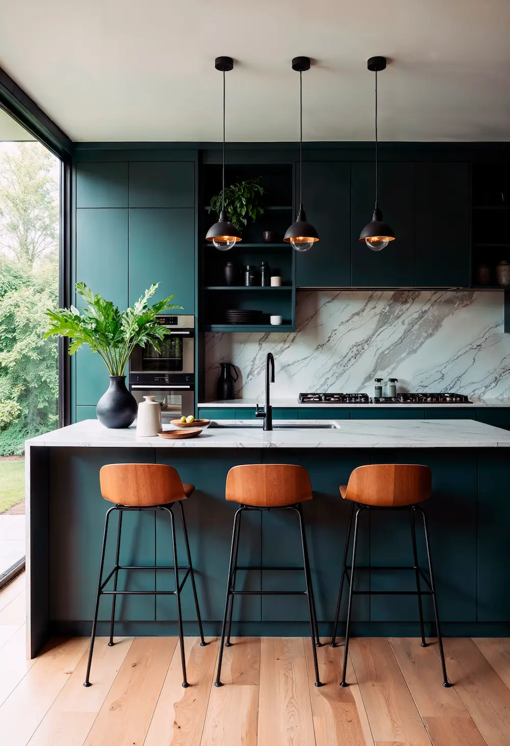 Puis viennent les couleurs, qui osent se démarquer : noir mat pour le contraste, vert sauge pour la douceur, bleu profond pour la sophistication. Souvent, ces teintes sont combinées avec des éléments clairs pour créer un équilibre graphique et vivant.