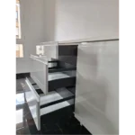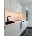 Le choix des coloris et des finitions renforce la luminosité naturelle de la pièce. Le blanc brillant des façades reflète la lumière et donne une impression d’espace. Associé à un plan de travail en stratifié blanc, le tout crée une continuité visuelle qui agrandit la pièce. Ce contraste minimaliste met en valeur la pureté des lignes et le design sobre de l’ensemble.