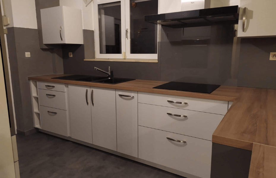Embarquez pour un voyage où le design rencontre la fonctionnalité. Cette cuisine Cosy en parallèle réalisée à Altkirch est signée Brigitte Küchen. Avec son mélange unique d'esthétique cosy et sa forme parallèle optimisé pour l'espace, cette cuisine promet : Coulissants multiples pour un rangement aisé Four Neff avec porte Slide & Hide pour une utilisation sans encombre Range épices/bouteilles de 30 cm pour une organisation optimale Des meubles hauts pour un stockage supplémentaire Élément ouvert pour bouteilles pour un accès facile Fond de hotte en verre (gris onyx) harmonisé avec la crédence pour une finition élégante Espace repas pour des moments conviviaux Four encastré pour un design épuré La finition en laqué mat apporte une touche contemporaine à cette cuisine. Les teintes de gris foncé au sol et au mur créent une harmonie visuelle, tandis que la cuisine elle-même demeure claire et épurée grâce à la couleur blanche des façades ce qui permet d’avoir un équilibre visuel. Le plan de travail en imitation bois ajoute une touche de chaleur à l'ensemble. Dans ce projet, nous avons dû faire face à quelques contraintes spécifiques. Tout d'abord, le client souhaitait recouvrir le carrelage au sol, ce que nous avons réussi à réaliser en optant pour des dalles PVC, offrant ainsi une solution pratique et esthétique. Ensuite, les clients ont exprimé le désir de changer le carrelage mural qui n'était plus à leur goût. Pour cela, nous avons utilisé un enduit béton pour recouvrir le carrelage existant et lui donner une nouvelle apparence. Cette réalisation à Altkirch souligne l'importance d'utiliser une sous-couche lors de la pose de dalles PVC pour prévenir la visibilité des joints de carreaux au travers des dalles. Elle offre également une solution créative pour moderniser le carrelage mural grâce à l'application d'enduit béton.
