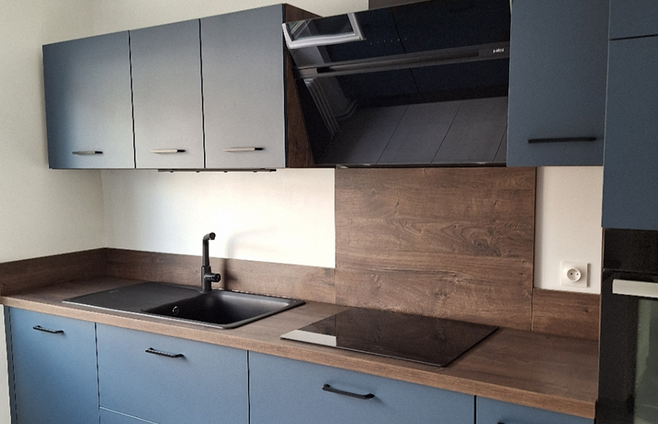 La teinte bleue apporte personnalité et modernité à l’espace, tandis que le bois naturel du plan de travail réchauffe l’ensemble et crée une atmosphère harmonieuse.