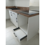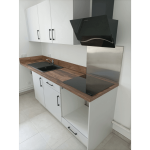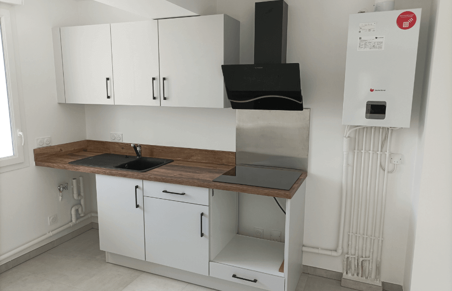 La Cuisine Contemporaine en L incarne une harmonie parfaite entre l'esthétique et la fonctionnalité, créant une expérience culinaire exceptionnelle : Les avantages de ce projet : Hotte inclinée pour une esthétique épurée : Cette disposition apporte une touche de modernité tout en maximisant l'efficacité de la ventilation. Emplacement stratégique pour le lave-vaisselle, optimisant l'espace : Cette conception ingénieuse permet d'utiliser l'espace au mieux, tout en facilitant l'accès au lave-vaisselle. Rangements hauts et bas pour une utilisation optimale de l'espace : Les armoires offrent une capacité de stockage généreuse, garantissant que chaque recoin de la cuisine est fonctionnel. Retour crédence, garantissant la protection du mur des éclaboussures et taches : Ce détail pratique assure la préservation de l'intégrité de la cuisine. Une façade au coloris Space Grey, pour un rendu moderne et élégant : La teinte intemporelle Space Grey confère une allure contemporaine et raffinée à la cuisine. Plan de travail en stratifié, imitant le chêne Hunton pour une touche naturelle : Le stratifié offre une durabilité exceptionnelle tout en évoquant la beauté naturelle du chêne Hunton. Tiroirs intelligemment conçus avec range-couvert intégré et tiroir sous le four : Ces tiroirs offrent une organisation optimale pour les ustensiles de cuisine et les couverts, tout en maximisant l'espace de rangement. Rangements placards pour maximiser l'espace de stockage : Les placards assurent un espace généreux pour ranger des articles de cuisine divers. La teinte intemporelle et élégante des façades laquées mat en Space Grey apporte une touche de modernité à l'espace. Le plan de travail stratifié imitant le Chêne Hunton se marie harmonieusement avec le retour crédence de la même couleur, créant une continuité visuelle qui évoque la nature. La hotte inclinée noire, la plaque de cuisson de la même couleur ainsi que l'évier contribuent à l'esthétique cohérente. Le tout est sublimé par des poignées noires fines qui ajoutent une touche finale de sophistication. Contraintes et Solutions :Les contraintes pour ce projet étaient minimes, à l'exception de la prise en compte de la tuyauterie et de l'impératif de rendre la cuisine fonctionnelle pour les futurs locataires. Cette réalisation à Saint-Martin d’Hères met en lumière l'importance de la durabilité et du design lors de la conception d'une cuisine destinée à la location. Le choix de matériaux robustes comme le stratifié pour le plan de travail garantit une longévité tout en offrant un esthétisme apprécié par les locataires, créant ainsi un espace de vie pratique et esthétiquement attrayant.