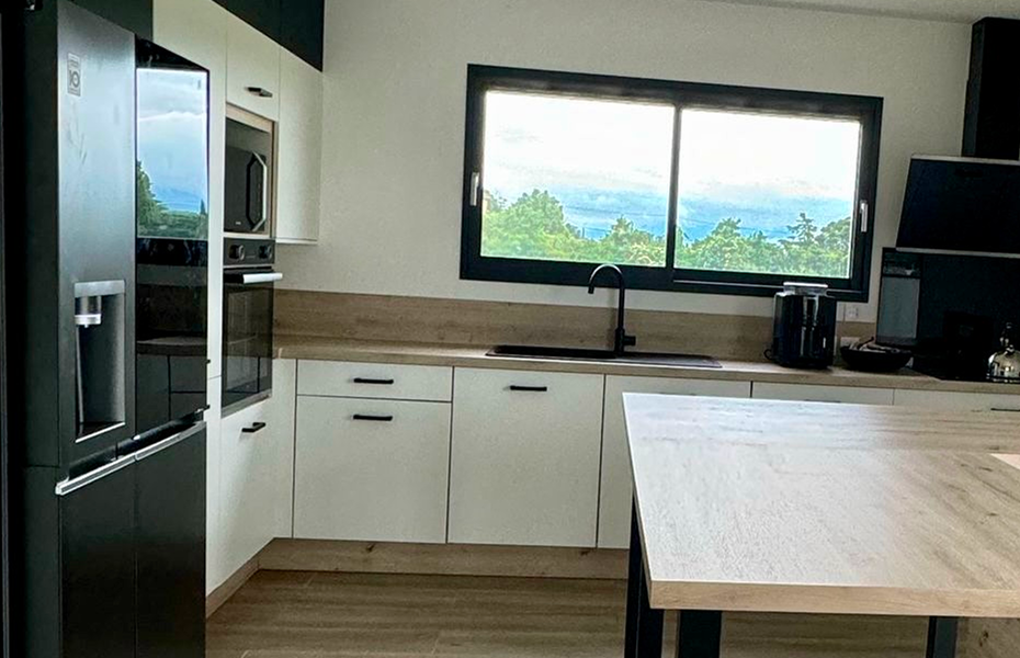 Ce projet avait pour objectif de créer une cuisine lumineuse et fonctionnelle, parfaitement intégrée à son environnement. Les façades blanches Implus apportent clarté et modernité, tandis que le plan de travail en Chêne Clair réchauffe l’ensemble avec une touche naturelle.