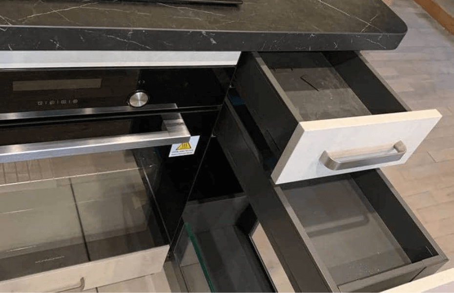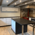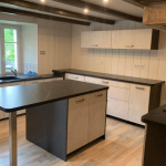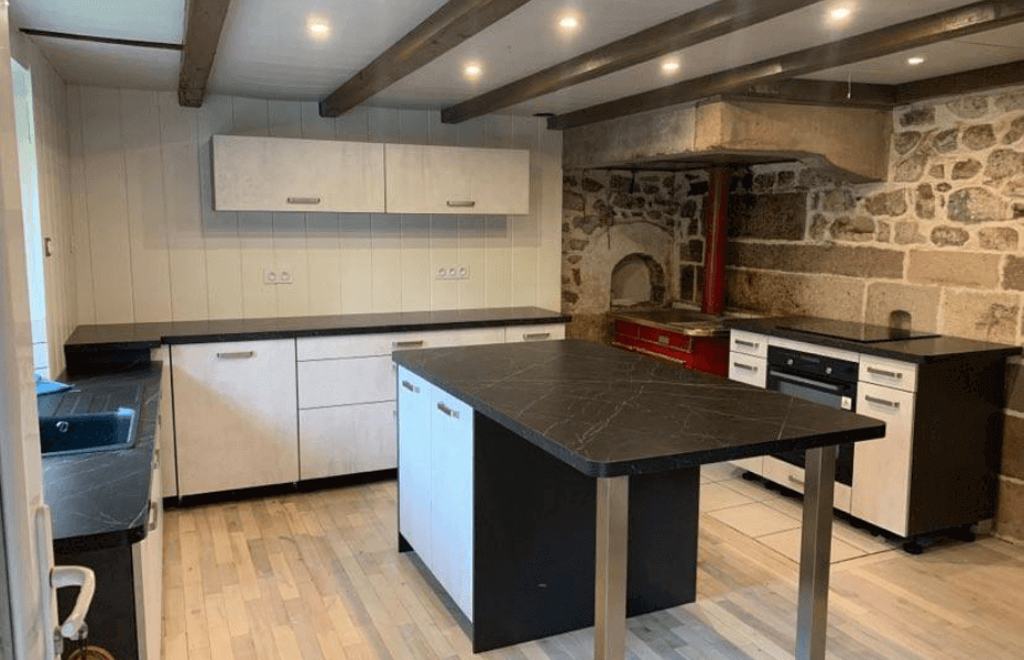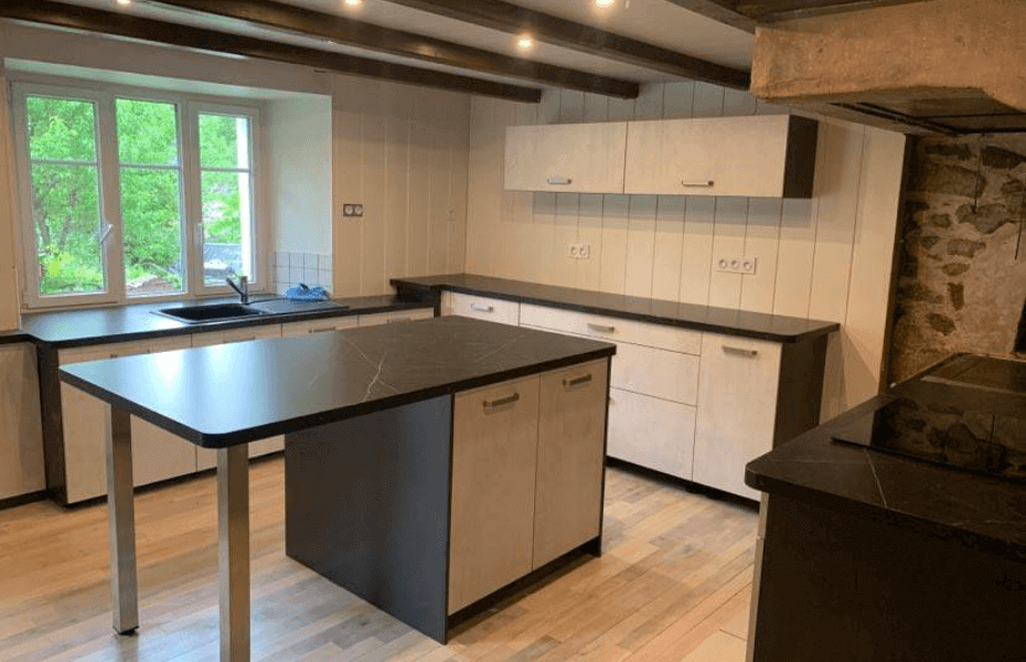 L'art de concevoir une cuisine réside dans la capacité à allier esthétique et fonctionnalité. Notre réalisation à Fresse en est la preuve vivante : Analyse précise : Chaque espace a ses spécificités. Avant de décider de l'implantation en L, notre équipe a évalué l'espace disponible, les besoins du client et les contraintes liées à l'intégration de l'îlot et du linéaire de cuisson. Esthétique & Finitions : La façade en béton clair caissons graphites apporte une touche contemporaine, tout en s'intégrant harmonieusement dans un environnement rustique, typique de la ferme du client. Les avantages pour ce projet : Équipements électroménagers : Marque Schneider Hotte Elica garantissant efficacité et longévité. Mobiliers de qualité : Fabriqués par le renommé fournisseur Impuls. Espaces de rangement optimisés : meubles bas avec coulissants, placards, meubles hauts, l’intégration d’un îlot central, un espace pour 2-3 personnes. Esthétique raffinée : plan de travail noir et caison en graphite contrastant avec des façades béton clair captant la luminosité tout en offrant une sensation chaleureuse. Contraintes et Solutions : L'espace disponible a été le principal défi, dû aux différents éléments à intégrer tels que l’îlot, le linéaire de cuisson et l’installation d’une hotte. Mais avec une analyse approfondie et une expertise, la Cuisine en L s'est avérée être la meilleure solution, offrant une esthétique moderne tout en répondant aux besoins fonctionnels. L'implantation en L est une merveille pour ceux cherchant à optimiser chaque centimètre. Elle offre un plan de travail généreux, tout en permettant d'intégrer de multiples éléments essentiels. Pour notre client à Fresse, cette configuration était la réponse idéale aux contraintes d'espace et d'intégration. Cette réalisation à Fresse montre bien comment : Le choix du plan de travail, un contraste de couleurs, comme le noir pour le plan de travail et le béton clair pour les façades, peut capter la luminosité tout en ajoutant de la chaleur à l'espace.