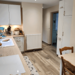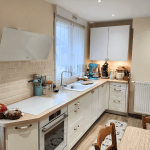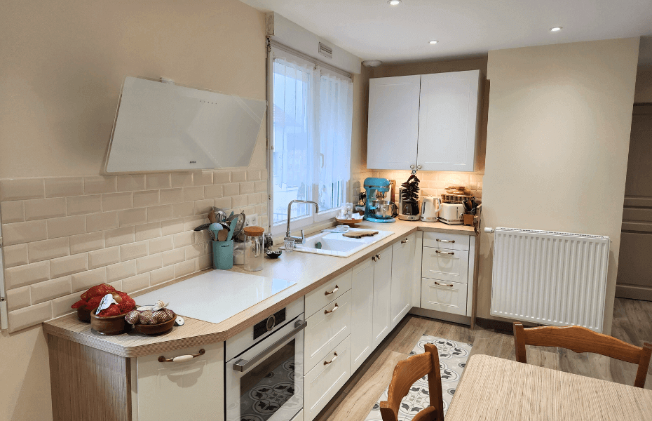 Au cœur de Thise, cette cuisine de 18 m² se dévoile dans toute sa splendeur. Chaque détail a été minutieusement conçu pour garantir confort et fonctionnalité. Les avantages notables du projet : Électroménager blanc : Une parfaite harmonie avec les couleurs choisies, ajoutant une touche de modernité. Poignées personnalisées : Une fusion ingénieuse de laiton massif et de porcelaine pour une touche rétro et élégante. Table sur mesure : Conçue pour s'intégrer parfaitement à l'espace, offrant un lieu de rassemblement accueillant pour la famille. Évier céramique design : Positionné astucieusement près de la fenêtre avec un mitigeur spécial pour maximiser l'espace et la fonctionnalité. Façades blanches laquées à cadre : Le blanc apporte luminosité et une impression d'espace, tandis que les cadres ajoutent une touche de sophistication. Le choix des couleurs blanches et beiges ne doit pas être sous-estimé. Ces teintes neutres créent une atmosphère apaisante, évoquant le charme d'une maison de campagne, tout en offrant une sensation moderne. Elles reflètent la lumière, donnant l'impression d'un espace plus vaste, ce qui est idéal pour les cuisines de taille modeste. Contraintes et Solutions :L'emplacement de l'évier, près de la fenêtre, a nécessité une solution astucieuse pour l'installation du mitigeur. Cette réalisation de cuisine contemporaine en L à Thise souligne également l'importance de l'éclairage sous les armoires pour éliminer les ombres sur le plan de travail, facilitant ainsi la préparation des aliments.