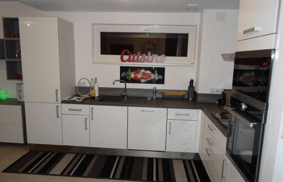 Cette réalisation à Saint-Louis présente une cuisine de forme "L", synonyme de praticité et d'esthétisme. Avantages clés : Plan de travail élevé à 1 mètre Abondance de rangements Fond de hotte en inox pour faciliter le nettoyage Électroménagers encastrés pour un design épuré Plinthes robustes en aluminium Plusieurs tiroirs coulissants pour un accès facile Laque blanche de haute qualité offrant une finition lisse Évier fonctionnel avec égouttoir Hotte aspirante murale pour une ventilation optimale. Le choix d'un laqué brillant blanc offre une touche d'élégance. Contrastant harmonieusement, le plan de travail et la crédence en bois foncé ajoutent une nuance chaleureuse. L'électroménager, fourni par Brandt et Faure, garantit durabilité et efficacité. Contraintes et solutions : Dans la conception de cette cuisine, nous avons relever des défis tels que la hauteur du plan de travail à 1 mètre et l'intégration du caisson technique a été essentiel. Le cahier des charges exigeant d'associer élégance, sobriété et robustesse a été parfaitement pris en compte. La complexité du projet résidait également dans l'objectif de proposer un tarif compétitif, en vue de la location de l'appartement. Cette conception à Saint-Louis montre comment le blanc laqué. La couleur blanche reflète la lumière, ce qui est idéal pour les espaces nécessitant plus de luminosité. Le blanc capte la lumière, illuminant votre cuisine. Associé à un plan de travail en bois, cela crée une ambiance accueillante.