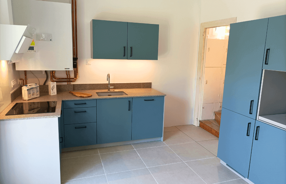 La Cuisine Contemporaine en L incarne la fusion parfaite entre l'esthétique et la fonctionnalité, offrant une expérience culinaire exceptionnelle : Avantages remarquables : Plan de travail en granit Fino Cuir : Ce matériau ultra résistant à la chaleur et aux rayures s'impose comme le partenaire idéal pour une utilisation quotidienne de votre cuisine. Optimisation de l'espace : Des solutions astucieuses comme la niche coulissante pour votre robot de cuisine permettent de le garder à portée de main tout en libérant de précieux espaces de travail. L'évier sous-plan avec rainurage optimise également la surface de travail tout en facilitant la préparation des repas. Coulissant avec réhausse pleine : Cet ingénieux système de rangement offre un espace supplémentaire, exploitant chaque centimètre de votre cuisine pour un rangement efficace. Bandeau LED sous meuble haut : Il assure un éclairage optimal, créant une ambiance agréable dans votre espace de cuisson. Électroménagers intégrés : Ils confèrent au design une homogénéité visuelle tout en simplifiant leur utilisation au quotidien. La couleur audacieuse Bleu Camélia des façades laquées mates insuffle une touche de fraîcheur et de modernité à l'ensemble. Le plan de travail en granit fino cuir (gris) ajoute une élégance sophistiquée. La hotte inclinée blanche et le fond de hotte assorti apportent une touche de pureté, tandis que les poignées noires fines viennent parfaire le look. Contraintes et Solutions :Une attention particulière a été nécessaire pour gérer la tuyauterie de la chaudière. Afin d'assurer une installation sans encombre, il a été recommandé aux clients de positionner la chaudière en amont, en fonction de la configuration de la cuisine. Cette précaution garantit une coexistence harmonieuse entre la cuisine contemporaine et les installations de chauffage, assurant un espace fonctionnel et esthétiquement plaisant. Cette réalisation à Fontaines met en évidence l'importance d'une planification méticuleuse, où le conseil au client de positionner la chaudière en tenant compte de l'agencement de la cuisine garantit une installation sans heurts.
