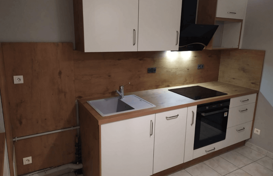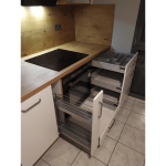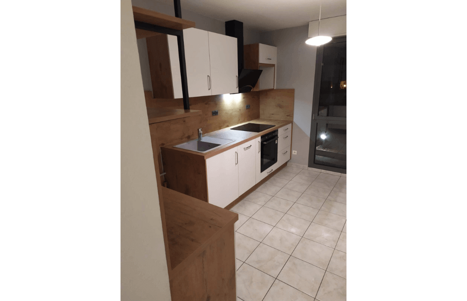 La cuisine Cosy en L de Toulouse est spécifiquement conçue pour optimiser l'espace et l'efficacité. Cette cuisine est conçue pour une location, dotée de grands panneaux pour cacher et englober les nombreux tuyaux à l'arrière. Les avantages de cette cuisine ne sont pas uniquement dans sa conception mais aussi dans ses caractéristiques uniques : Meuble haut avec étagères amovibles pour maximiser l'espace de rangement et pour un accès facile Tiroir à épices et à ustensiles pour une organisation optimale Hotte inclinée pour un confort optimal lors de la cuisson Buffet pour un rangement supplémentaire Niche pour micro-ondes pour un gain de place considérable Malgré la contrainte de nombreux tuyaux à l'arrière de la cuisine, nous avons réussi à optimiser les rangements en partie haute et basse, à proposer un plan de travail très profond et un petit buffet pour ranger davantage d'objets. L'ensemble est fini en laqué mat blanc et chêne vintage, créant un espace à la fois élégant et confortable. Les matériaux et les finitions ont été soigneusement choisis pour leur qualité et leur esthétique. La cuisine, fabriquée par Impuls, et l'électroménager, de marque Schneider, garantissent la durabilité et l'efficacité.