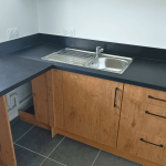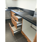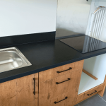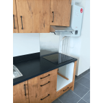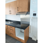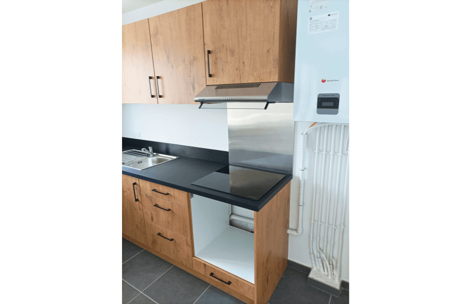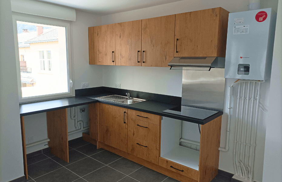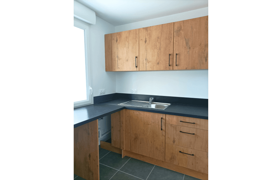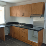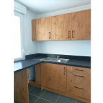 Cette cuisine a été soigneusement conçue en pensant spécifiquement aux propriétaires qui envisagent de mettre leur bien en location. Cette cuisine en forme de L, chaleureuse et accueillante, occupe 20m² et offre un espace généreux parfaitement adapté à un logement de type T3. Découvrez les caractéristiques distinctives de ce projet : Avantages remarquables : Niche dédiée pour le lave-vaisselle et la machine à laver : Cette disposition facilite la vie des locataires qui peuvent aisément installer leurs propres appareils, garantissant ainsi leur confort. Tiroirs coulissants avec tiroirs : Ils maximisent l'espace de rangement, offrant une solution pratique pour garder la cuisine bien organisée. Rangement optimisé sous la hotte casquette : Cette utilisation intelligente de l'espace assure une cuisine dégagée et fonctionnelle. Évier avec égouttoir : Pratique pour un séchage rapide de la vaisselle, il améliore l'efficacité de la cuisine. Plaque de cuisson intégrée : Idéale pour la préparation de repas rapides et délicieux. Fond de hotte en métal : Facilité d'entretien et durabilité accrue, pour une cuisine qui reste impeccable. Meubles hauts : Offrent davantage d'espace pour ranger la vaisselle et les ustensiles, contribuant ainsi à maintenir la cuisine bien rangée. Les façades en chêne apportent une touche de chaleur à l'espace, tandis que le plan de travail stratifié noir ajoute une élégance moderne. La hotte intégrée en acier inoxydable et le fond de hotte en inox créent une harmonie visuelle avec l'évier, offrant un look cohérent. Les poignées noires et discrètes complètent le tout, ajoutant une touche finale de sophistication. Contraintes et Solutions :Compte tenu de son utilisation en location, le propriétaire n'a pas souhaité fournir tout l'électroménager, ce qui a nécessité une conception astucieuse. La cuisine a été aménagée de manière à laisser suffisamment d'espace pour que les locataires puissent installer leurs propres appareils. Cette réalisation à Saint-Martin d’Hères met en lumière l'importance de privilégier des designs intemporels pour les propriétaires cherchant à louer leur bien. Cela garantit que votre propriété restera attractive pour les locataires potentiels pendant de nombreuses années à venir, tout en offrant un espace de vie fonctionnel et esthétiquement plaisant.
