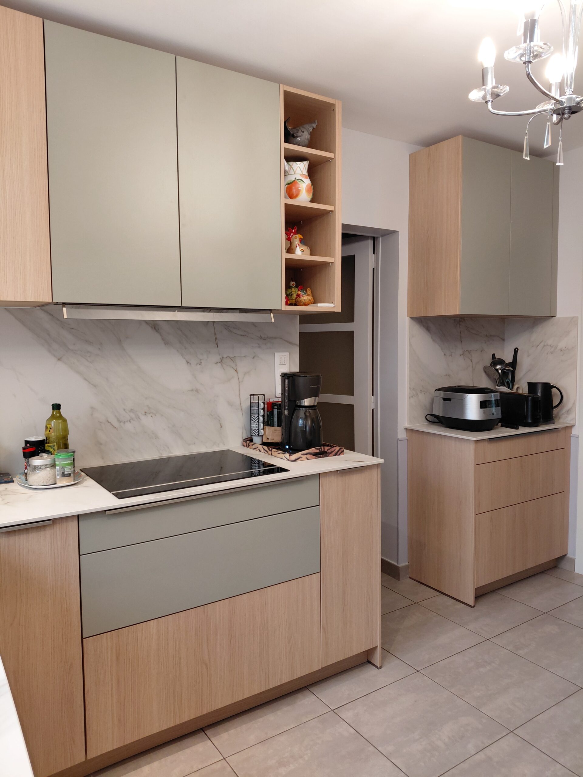 Ce couple souhaitait moderniser sa cuisine et gagner en luminosité. Le projet a débuté par l’ouverture d’une fenêtre afin d’optimiser l’apport en lumière naturelle. L’intégralité de la pièce a ensuite été repensée, avec une nouvelle implantation et une peinture entièrement refaite.