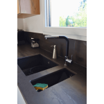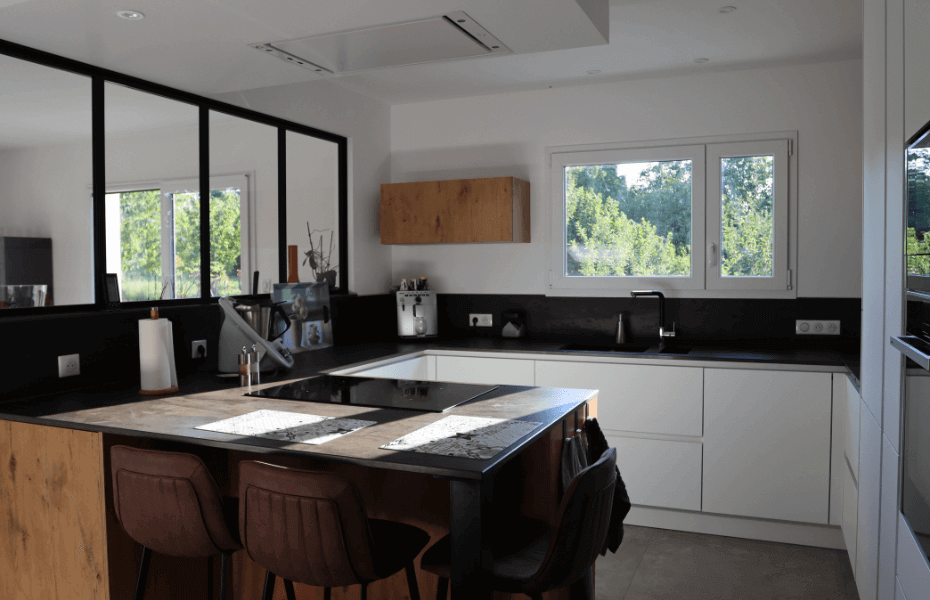Cette cuisine Cosy en U, couvrant une superficie de 15 m² à Chasselay, incarne parfaitement le mariage réussi entre design et fonctionnalité. Voici ses caractéristiques principales : Esthétique et matériaux : L'association élégante de meubles blancs laqués et de mélaminé bois chêne, complétée par un plan de travail en Dekton Trillium, confère à cette cuisine une ambiance à la fois moderne et chaleureuse. Optimisation de l'Espace : Les rangements ont été minutieusement conçus pour maximiser chaque centimètre disponible, avec notamment des coulissants en verre et un évier intégré sous le plan de travail. Luminosité et convivialité : L'agencement astucieux et les matériaux judicieusement sélectionnés apportent une luminosité et une chaleur qui favorisent le partage et la convivialité. Le contraste harmonieux entre le blanc lumineux et le bois chêne crée une atmosphère cosy et élégante, renforçant la sensation d'espace et de lumière. Le choix du plan de travail en Dekton Trillium ajoute une touche de modernité tout en garantissant la durabilité de l'ensemble. Cette réalisation de cuisine Cosy en U à Chasselay illustre parfaitement comment l'utilisation de matériaux de qualité tels que le Dekton pour le plan de travail permet de marier efficacement la durabilité à une esthétique soignée, créant ainsi une cuisine à la fois fonctionnelle et élégante.