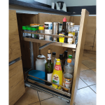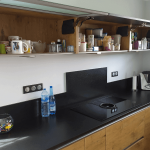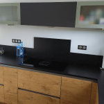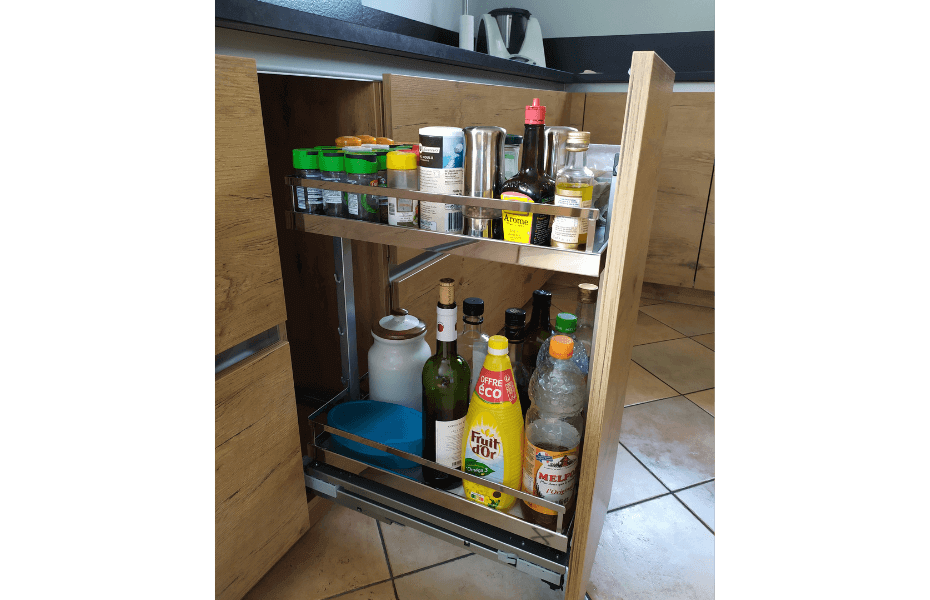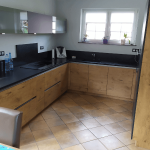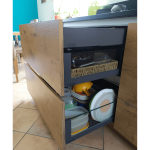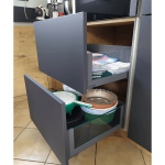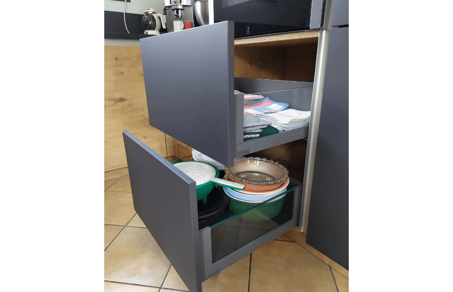 Notre réalisation, la cuisine design en U à Nantes, démontre notre expertise et notre attention aux détails. Voici une description détaillée de cette conception unique : La cuisine est dotée d'un plan de travail en granit noir Zimbabwe d'une épaisseur de 3 cm, avec une crédence assortie. Ce choix audacieux de Gris Anthracite donne à la cuisine un aspect élégant et contemporain, tout en offrant une surface de travail robuste et facile à entretenir. Pour conserver une esthétique épurée, la cuisine est conçue sans poignée. A la place, un profil en inox est utilisé, offrant un design élégant tout en garantissant une manipulation aisée des portes et des tiroirs. Les coulissants sont dotés de parois latérales en verre transparent, ce qui ajoute une touche de raffinement à la conception et permet une visibilité parfaite du contenu. La couleur Chêne Castel a été choisie pour les caissons intérieurs en bois et la façade des meubles, ce qui donne à la cuisine une atmosphère chaleureuse et accueillante tout en complétant parfaitement le plan de travail Gris Anthracite. Nous avons utilisé le système Lemans (haricot) pour aménager le meuble d'angle, optimisant ainsi l'espace et facilitant l'accès aux ustensiles de cuisine. La cuisine est équipée d'une plaque de cuisson avec hotte intégrée. Cette solution innovante permet de garder l'air de la cuisine propre et frais sans encombrer l'espace avec une hotte traditionnelle. Le four Neff équipé de la porte qui glisse (modèle Slide n' Hide) permet une utilisation facile et sécurisée, surtout lorsque la cuisine est en pleine effervescence. L'agencement en U de la cuisine intègre également un buffet du côté de la table à manger, offrant un espace de rangement supplémentaire tout en servant de séparation naturelle entre les zones de cuisson et de repas. Les meubles hauts vitrés avec éclairage intégré sous le meuble ajoutent non seulement une dimension esthétique à la cuisine, mais garantissent également une bonne visibilité lors de la préparation des repas. Ces éléments se combinent pour créer une cuisine qui est aussi fonctionnelle qu'esthétique, répondant aux besoins précis de notre client tout en respectant ses préférences de style et de design.