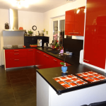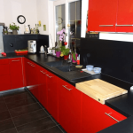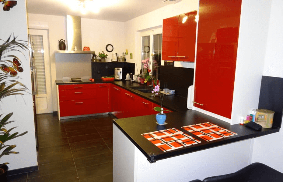 Une cuisine Design en U signée Schroder Küchen, où l'audace des couleurs et le raffinement du design se rencontrent pour créer une pièce ouverte captivante. La cuisine laquée rouge, sublimée par le choix du noir, apporte une touche contemporaine et dynamique à cet espace. Pour préserver une esthétique cohérente, nous avons opté pour des façades de type porte identiques sur l'ensemble des meubles. Cette uniformité s'étend aux aménagements intérieurs optimisés, garantissant un espace fonctionnel sans compromis sur le style. Meuble d'angle optimisé avec tourniquet et 2 plateaux tournants Multiples espaces de rangements avec coulissants Petit îlot central avec vue sur salon et salle à manger Colonne dédiée pour réfrigérateur et congélateur Meuble ouvert - parfait pour les livres ou les bouteilles Lave-vaisselle encastré pour un design épuré Range épices pratique Plan de travail au look métallique raffiné Le choix audacieux de la palette de couleurs rouge et noir apporte une modernité saisissante à l'espace. Le plan de travail en stratifié noir évoque l'élégance du granit noir Zimbabwe, créant une cohésion visuelle frappante. La finition laquée acrylique haut de gamme ajoute une profondeur visuelle impressionnante tout en assurant des façades uniformes pour un look épuré et contemporain. La colonne apposée sur mesure et la fausse façade au-dessus illustrent la flexibilité et l'adaptabilité du design pour surmonter les défis techniques. Cette solution astucieuse a été mise en place pour s'adapter à la présence d'un tuyau d'évacuation situé derrière. Cette réalisation à Saint-Louis démontre avec éclat qu'une cuisine colorée, tendance et élégante peut être réalisée avec succès. Cependant, il est essentiel de considérer soigneusement vos projets futurs. Nous recommandons d'éviter les couleurs trop vives ou personnalisées si vous envisagez de vendre votre maison à court terme, afin de garantir une attractivité optimale auprès des futurs acheteurs.