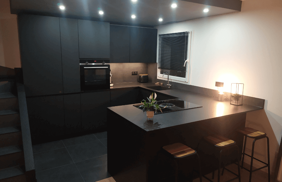 La Cuisine Industrielle en U à Pays de Gex est le fruit d'une conception méticuleuse. Elle est idéalement conçue pour offrir le maximum de rangements tout en garantissant une ambiance accueillante dans un espace réduit. Parmi ses caractéristiques : Espace repas pour 3 personnes : favorise la convivialité et l'interaction pendant les repas. C'est idéal pour les familles ou les personnes qui aiment recevoir des invités. Plaque de cuisson avec hotte intégrée : permet de gagner de l'espace sur les murs. Cela donne à la cuisine un aspect plus épuré et esthétique. Meuble haut avec spots lumineux intégrés :offrent une lumière douce et agréable dans la cuisine. Cela crée une atmosphère chaleureuse. Pratique pendant la préparation des repas. Meuble d'angle avec système de demi-lune : permet d'utiliser efficacement l'espace souvent sous-exploité dans les coins. Permet d'optimiser l'espace de rangement de la cuisine et de garder les éléments essentiels à portée de main. Évier sous plan : offre un aspect esthétique épuré et facilite le nettoyage. Facilite l'entretien et permet d'optimiser l'espace du plan de travail. Électroménagers intégrés : crée une apparence harmonieuse et uniforme dans la cuisine, sans éléments en saillie. Permet d'optimiser l'espace de travail disponible et facilite le nettoyage. Colonne à épicier : offre un accès facile aux différentes épices et permet de les garder organisées et à portée de main pendant la préparation des repas. Rangements optimisés : permettent de maximiser l'utilisation de l'espace disponible et permet de garder la cuisine bien rangée et fonctionnelle. Le choix de la couleur et des finitions a joué un rôle crucial dans l'embellissement de cet espace. La laque noire mate sans poignées des meubles apporte une sophistication discrète à l'ensemble. Le plan de travail en granit noir Zimba, assorti d'un évier sous plan et d'un robinet col de cygne, accentue cette esthétique industrielle raffinée. Malgré la contrainte du lave-vaisselle sous le four, une colonne sur mesure a été créée pour assurer une intégration parfaite et un design cohérent. La Cuisine Industrielle en U allie esthétiquement utilité et style. Elle répond à des besoins pratiques tout en offrant un espace de vie agréable et attrayant.