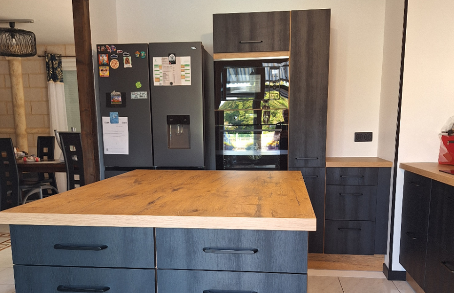 Réalisation d’une cuisine au Blanc (36), mettant à l’honneur un total look bois structuré avec des façades en Chêne Brûlé associées à un plan de travail en Chêne Vintage.