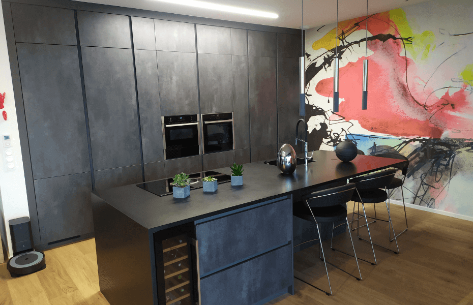 Vous êtes propriétaire d'une maison, d'un appartement, d'un logement et vous avez un projet d'aménagement intérieur ou de rénovation ? Imaginez votre cuisine transformée en une oasis moderne de confort et d'efficacité. C'est précisément ce que Cuisines Oméga a réalisé pour un projet d'envergure à Besançon. En concevant une cuisine d'une grande beauté et d'une fonctionnalité incomparable, nous avons créé un espace qui est non seulement esthétiquement impressionnant mais aussi extrêmement fonctionnel. Pensez à un espace de 300m², avec une cave à vin élégante, une porte dérobée vers le cellier, un îlot central impressionnant de plus de 3m de longueur, le tout avec des électroménagers intégrés et un espace repas convivial. Laissez-vous séduire par le raffinement d'une cuisine contemporaine d'une hauteur allant jusqu'à 2.80m avec des façades au ton béton foncé, qui donne une impression de grandeur et un design très moderne. Et si cette vision était à portée de main? N'hésitez pas à demander un devis ou prendre rendez-vous avec Cuisines Oméga pour transformer vos rêves en réalité.