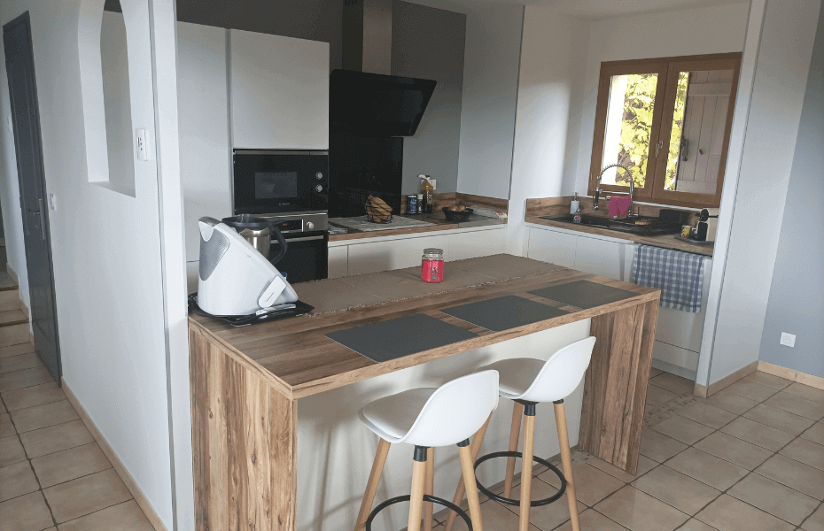 Cette cuisine cosy avec îlot central de 20m², judicieusement conçue pour maximiser à la fois l'espace et le confort visuel, intègre une série de fonctionnalités qui en font un espace à la fois esthétique et pratique. Située au cœur d'un cadre résidentiel, elle intègre un îlot central qui se révèle être bien plus qu'un simple élément de design ; il est le pivot fonctionnel de cet espace culinaire. Les avantages clés de cette conception : Élégance moderne : Les façades laquées mat sans poignée offrent une apparence lisse et contemporaine, contribuant à un design minimaliste qui agrandit visuellement l'espace. Fonctionnalité intégrée : Le range-épices avec finition en fil plat chromé et plateau bois ne sert pas seulement de rangement pratique, mais ajoute également une touche esthétique raffinée à l'ensemble. Les tiroirs à l'anglaise sous la plaque de cuisson et les coulissants en verre transparent permettent un accès facile et rapide aux nécessités culinaires. Optimisation de l'espace : L'îlot central n'est pas seulement un point focal, mais il offre aussi un plan de travail important et des rangements ingénieux sous sa structure, maximisant l'utilisation de chaque centimètre disponible. Intégration des appareils : La présence d'un réfrigérateur et d'un lave-vaisselle intégrés garantit une continuité visuelle, permettant une fusion parfaite avec le reste de la cuisine. Les contraintes rencontrées et les solutions mise en placeLa principale contrainte du projet concernait le changement des emplacements des installations électriques, nécessaire pour accommoder la nouvelle disposition et l'intégration des appareils électroménagers modernes. La solution a été d'élaborer un plan précis d'installation électrique avant la mise en place des éléments de cuisine, assurant ainsi que toutes les nécessités énergétiques des appareils soient satisfaites efficacement et en toute sécurité. Le choix des couleurs a été méticuleusement pensé pour créer un environnement harmonieux et accueillant. Les façades en blanc mat se marient parfaitement avec le plan de travail stratifié effet Bois Mississippi Pine, ajoutant une dimension de chaleur au design épuré. Le fond de hotte en verre noir, assorti à la hotte inclinée, la plaque de cuisson et l'évier avec égouttoir, renforce cette élégance contemporaine. Ce contraste entre les éléments blancs lumineux et les touches de bois riche crée un espace dynamique qui reflète la lumière, amplifiant la sensation d'espace et de pureté. Cette réalisation de cuisine cosy avec îlot central à Bellegarde-en-Forez illustre comment des choix de design réfléchis et une utilisation stratégique des couleurs et des matériaux peuvent transformer un espace fonctionnel en un lieu de vie élégant et accueillant, tout en répondant aux défis techniques et esthétiques du projet.