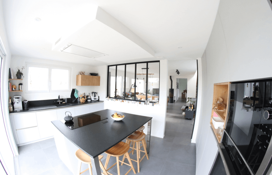 Pour ce projet l’envie de notre client était de créer une cuisine avec une colonne murale, mais avec une touche design. Cet objectif a été atteint en intégrant une niche en bois dans le bloc colonne, donnant ainsi un aspect allégé et moderne. Cet espace accueille le réfrigérateur, le four et le micro-ondes, et offre un abondant espace de rangement, parfait pour une organisation optimale. Au cœur de la cuisine, l'îlot central se distingue par sa plaque de cuisson de marque Novy, un produit haut de gamme dans l'industrie de la cuisine. En plus de cela, une prise de courant a été astucieusement installée sur l'îlot, rendant l'utilisation des appareils de cuisine un véritable jeu d'enfant. Le design linéaire de la cuisine intègre harmonieusement le lave-vaisselle et l'évier, ce qui maximise l'efficacité de la zone de lavage. Pour ajouter une touche d'élégance supplémentaire, nous avons choisi le granit de couleur noir Zimbabwe, qui contraste superbement avec les tons gris clair de la cuisine. Les principaux avantages de ce projet comprennent : Hotte intégrée au plafond: Assure une ventilation efficace tout en étant discrète et esthétiquement plaisante. Mur de rangement: Optimise l'espace et réduit l'encombrement pour une cuisine plus organisée. Électroménagers intégrés: Ils se fondent parfaitement dans le design, offrant une efficacité optimale. Prise intégrée à l'îlot: Une commodité essentielle pour l'utilisation de divers appareils de cuisine. Évier sous plan: Confère un look épuré et facilite le nettoyage. Espace repas sur l'îlot: Permet de transformer l'îlot en un espace de repas convivial. Enfin, pour rehausser le design global de l'espace, nous avons créé une verrière avec une porte coulissante qui donne sur le salon et la salle à manger. Cette caractéristique ajoute non seulement une dimension esthétique à la pièce, mais elle assure aussi une transition fluide entre les différents espaces de la maison.