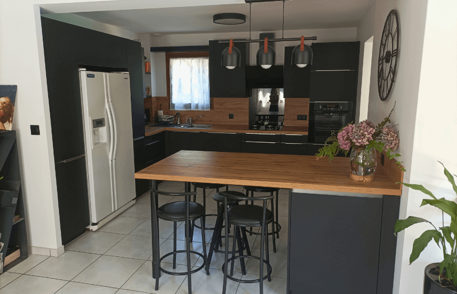 La Cuisine Design avec îlot central à Murianette est une véritable symphonie de technicité et de style. Conçue avec le savoir-faire allemand du fabricant Ballerina, elle incarne la robustesse et la durabilité à leur plus haut niveau. Chaque élément, du sublime îlot central au choix méticuleux des couleurs, reflète une expertise inégalée. Les avantages de cette cuisine d'exception sont nombreux : Façade Resopal : Oubliez les traces et les rayures gênantes. La façade Resopal résiste à l'épreuve du temps, conservant sa beauté originelle. Tiroirs coulissants : Accédez aisément à vos ustensiles et ingrédients, facilitant ainsi chaque étape de votre préparation culinaire. Poignées discrètes : Les poignées posées sur le chant des façades apportent une touche de modernité et de minimalisme au design de la cuisine. Intégration parfaite du frigo américain : Une niche sur-mesure a été soigneusement créée pour intégrer harmonieusement le frigo américain, ajoutant à l'ensemble une esthétique épurée et sans pareille. Four en hauteur : L'ergonomie a été prise en compte pour éviter les contorsions inutiles lors de la cuisine, garantissant ainsi un confort optimal. Micro-onde discret : Dissimulé derrière une façade, il libère l'espace de travail tout en contribuant à l'esthétique générale. Espace repas intégré à l'îlot central : Un lieu parfait pour partager des repas informels en toute convivialité. Plan de travail stratifié : Alliant durabilité et élégance, le plan de travail stratifié est conçu pour résister à l'épreuve du temps tout en offrant un aspect esthétiquement plaisant. Pieds noirs robustes : Ces pieds assurent une stabilité optimale tout en ajoutant une touche d'élégance à l'ensemble. Les façades laquées noires mates, associées aux tons chaleureux du bois de chêne des plans de travail et des crédences, créent une atmosphère accueillante et moderne. Les poignées grises discrètes, positionnées avec finesse sur le chant des façades, ajoutent une touche subtile d'élégance à cet ensemble remarquable. Contraintes et Solutions :Face à des exigences précises de la cliente, nous avons relevé avec brio les défis suivants : Façade impeccable : La cliente avait pour impératif d'avoir une façade de cuisine exempte de traces et de rayures. Notre solution a été de lui proposer nos façades en Resopal, qui ont pleinement répondu à cette demande en offrant une surface impeccable et résistante. Intégration du réfrigérateur américain : Pour répondre à l'aspiration esthétique de la cliente tout en garantissant la fonctionnalité, nous avons conçu une niche sur-mesure spécialement sculptée pour le réfrigérateur américain. Cette intégration harmonieuse est le parfait exemple de l'alliance entre forme et fonction. Cette réalisation à Murianette témoigne que, lors de la conception d'une cuisine, l'accent doit être mis non seulement sur l'esthétique, mais également sur la fonctionnalité. Les matériaux de haute qualité, tels que le Resopal, offrent à la fois durabilité et esthétisme, garantissant que votre cuisine restera un espace fonctionnel et élégant pour de nombreuses années à venir.