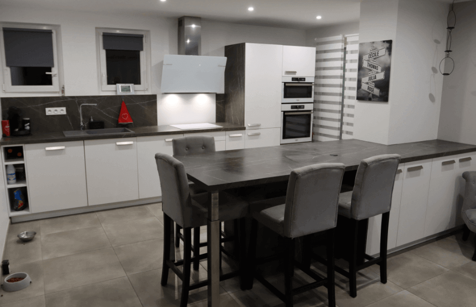 Cette cuisine contemporaine ouverte, s'étendant sur une généreuse surface de 25m², a été conçue pour offrir un espace de vie polyvalent, fusionnant esthétique moderne et fonctionnalité avancée. Les avantages et caractéristiques de ce projet : Maximisation de l'Espace : L'agencement en U optimise chaque centimètre, offrant un vaste espace de travail et de multiples rangements. Conception Ergonomique : Les coulissants en verre et le plan de travail stratifié gris veiné permettent une utilisation fluide au quotidien. Intégration d'Électroménagers : Les appareils Whirlpool s'intègrent parfaitement, offrant performance et élégance. Luminaires Élégants : L'éclairage intégré sous les meubles hauts apporte une ambiance chaleureuse et fonctionnelle. Prise Escamotable : Installée sur l'îlot, elle offre une solution pratique pour les appareils électroménagers. L'association du blanc et du gris crée un effet visuel saisissant, apportant une luminosité exceptionnelle et une impression d'espace agrandie. Les couleurs choisies s'accordent harmonieusement avec le style contemporain de l'appartement, créant une ambiance à la fois moderne et accueillante. La Cuisine Contemporaine Ouverte à Villefranche sur Saône montre parfaitement que l'îlot central ne sert pas seulement de plan de travail mais intègre également une table pour manger. Cela montre comment un élément de design peut être à la fois pratique et élégant, transformant la cuisine en un lieu de convivialité et de partage.