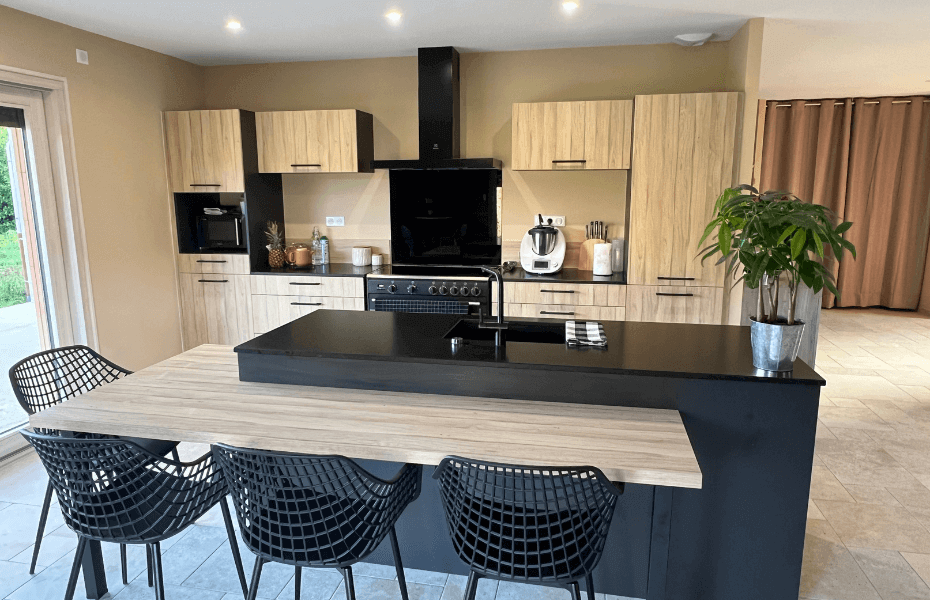 Ce projet de cuisine linéaire avec îlot s'articule autour d'un design contemporain, alliant le bois clair à un plan de travail en granit noir. Le piano de cuisson, pièce centrale de l'aménagement, ajoute une touche de sophistication à l'ensemble. Les avantages de cette réalisation comprennent : Niche pour le micro-ondes : Parfaitement intégrée pour un gain de place considérable. Espace repas : Un îlot central confortable pour partager des repas en famille ou entre amis. Électroménagers intégrés : Des équipements de marque Ballerina, Smeg et Schneider, synonymes de qualité et de longévité. Crédence en verre noir : Un choix esthétique qui offre une touche d'élégance. Réhausse en verre dépoli : Un détail subtil qui fait toute la différence. Optimisation de rangement : Maximiser chaque espace pour une cuisine toujours ordonnée.