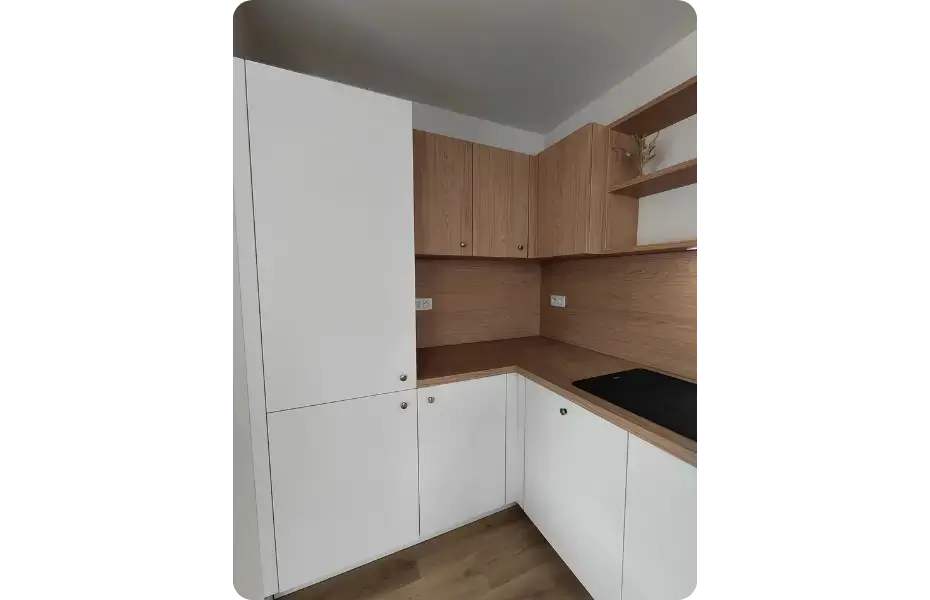 Le mariage du blanc et du bois donne ici le ton. Le blanc structure l’espace et maximise la lumière naturelle, pendant que le bois vient réchauffer l’ensemble. Le stratifié a été choisi pour sa résistance et sa facilité d’entretien. Cette combinaison répond à la fois aux attentes d’un acheteur potentiel et aux exigences d’un usage quotidien.