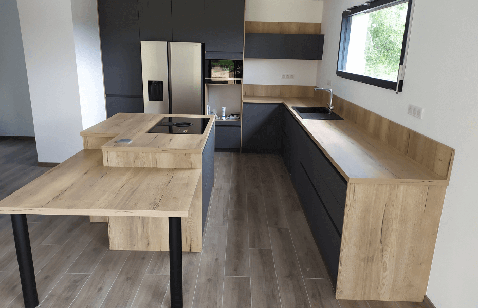 En mettant l'accent sur un style épuré et moderne, cette grande cuisine ouverte sur le salon et la salle à manger offre un espace de vie intégré et fluide. Le laqué mat gris anthracite anti-trace de doigts a été choisi pour les colonnes et les parties basses, offrant une finition contemporaine et facile à entretenir. Ce choix de couleur contraste superbement avec le chêne rouvre du plan de travail stratifié. La crédence assortie et la joue sur mesure apportent une touche d'harmonie et de chaleur à l'ensemble. Un îlot central doté d'un espace repas en forme de L à la hauteur de la table pour plus de convivialité et de partage. Une plaque de cuisson de marque Elica avec hotte intégrée pour un gain de place optimal. Des meubles hauts avec éclairage intégré pour un confort visuel accru. Un tiroir à déchets sous l'évier pour un recyclage facile et discret. L'intégration d'un réfrigérateur américain, solution pratique et esthétique pour tous vos besoins de stockage. La principale contrainte de ce projet était l'intégration du réfrigérateur américain. Grâce à la rigueur de David et son expertise, cette contrainte a été transformée en un atout de design et de fonctionnalité. Cette réalisation est signée par la marque allemande Ballerina, gage de qualité et de durabilité. Fidèle à la réputation de la marque, cette cuisine combine avec brio esthétisme et fonctionnalité. Une cuisine qui n'est pas seulement un lieu de préparation des repas, mais aussi un espace pour se rassembler, échanger et se détendre.